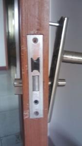 2、然后拿下面板把手即可,如果换锁芯的话,接着拆护锁套的两颗螺丝,然后拿下护锁套来。